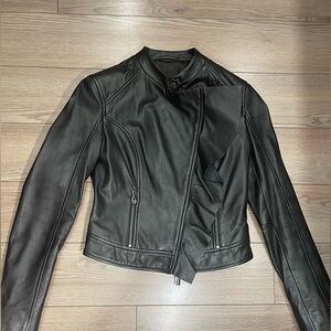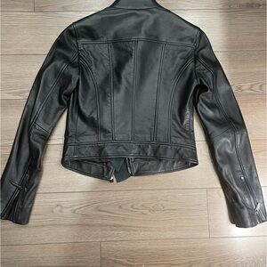 Selling an original MARCIANO Daniel Moto-Zip Ruffle Leather Jacket in like NEW condition (NO damages, scuffs, stains). It has been worn only once. Size: XS 100% Genuine Leather Define yourself in this edge-driven leather jacket. Features a collarless silhouette and moto-zip structure that's balanced with a romanticized ruffled trim. Front zipper pockets and zipper sleeves.