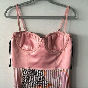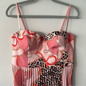 Pleated dress by Marciano made of fluid fabric with midi length. The model features a fitted upper with formed underwired cups and removable thin straps, and a romantic pleated skirt, and is finished with colorful all-over print with chain and animal motifs.