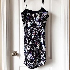 MARCIANO Night Motion Ruched Dress NWT. Gorgeous silky feel black dress with allover multicolor splashes of pink, blue, purple and white pattern in a flattering bodycon silhoutette. Features square neckline, adjustable shoulder straps, side ruching design. fully lined and back-zip closure details. Perfect for a glamorous night out or party.