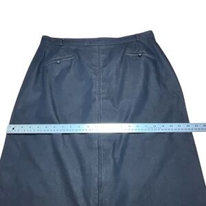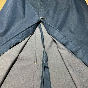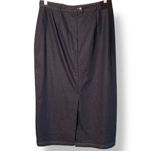 MADE IN GERMANY. Very dark blue wash chambray / denim maxi skirt. Front zipper zips up only for ease of movement. Back vent. Faux front pockets. Photos are important so please check all for condition, detail and measurements.