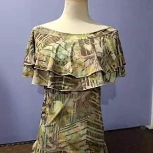 This dress has such a fun summery pattern! Giving Y2k geometric jungle vibes. It is super stretchy and is also lined. The neckline features 2 layers of ruffles, adding a bit of soft motion. The cut is fitted to the body and sits just above the knee. This piece is in excellent condition and has no flaws. It's the perfect party dress and would be excellent for travel as it doesn't wrinkle easily.