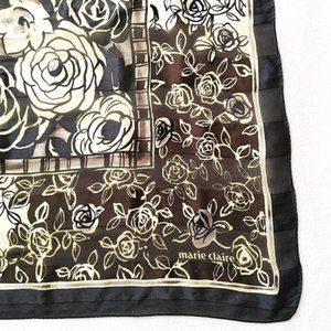 Elegant MARIE CLAIRE 100% Pure Silk Large Square Scarf Printed Marie Claire with Floral Print in classy multi-color Taupe Grey Green Light-Yellow Brown with Black Border.