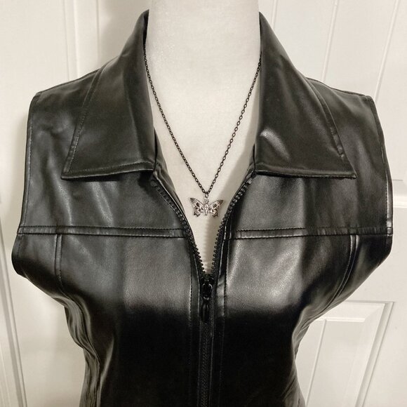 This fabulous Y2K era black faux leather (aka, pleather/vegan leather) zip-up vest is an ideal layering piece that can also be worn as a standalone top, if so desired. ๐ค