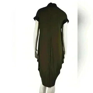 Characterized by architectural silhouettes and luxurious fabrics, Marie Saint Pierre's olive green tunic dress is crafted with comfort in mind from polyester spandex Its forgiving fit and contrast black collar detail exude elegance, made in Canada