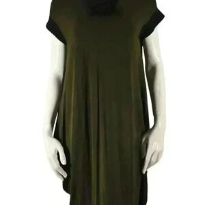 Characterized by architectural silhouettes and luxurious fabrics, Marie Saint Pierre's olive green tunic dress is crafted with comfort in mind from polyester spandex Its forgiving fit and contrast black collar detail exude elegance, made in Canada