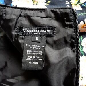 Gorgeous multicoloured floral print pencil skirt from Mario Serrani. Print pattern has red dragon snaps, pink roses, blue irises, white daisies, and orange purple and cream pansies on a black background. Great for office looks or Sunday brunch outfits. Feminine and flattering. Has inner lining, hidden zipper and back slit.