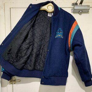 Leather Sport Unisex Jacket, No Fabric/Size Tag, Fit Size M/L, Color Blue, Leather Trim Blue, Orange, Wool Textured, Quilt Lined, Side Pockets, Embroidery, Closure Snap Button Down, Good Condition, Bomber Jacket, Great Look, Great Fit.