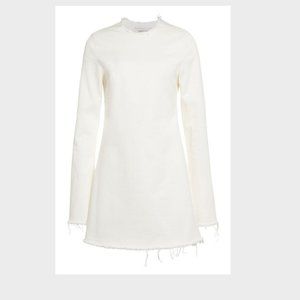 Frayed edges add a grungy element to this flattering long-sleeve minidress constructed from soft, snowy denim.