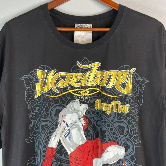 Men’s metallic gold, white grey and red on black Born To Be Muay Thai Boxing Graphic Crewneck Short sleeve Tee.