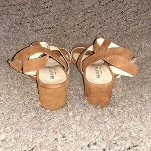 Chestnut brown suede double ankle straps, covered block heel and toe area.