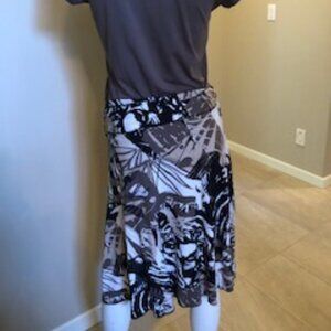 MARZ Impression Viscose Blend A-Line Abstract Pattern Midi Skirt in Black/White/Tan/Brown w Matching Belt, Elasticized Waist