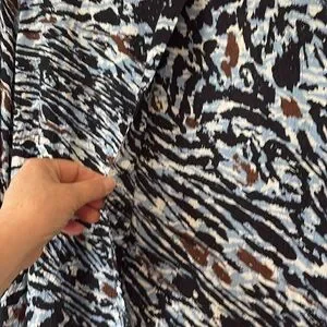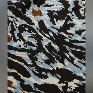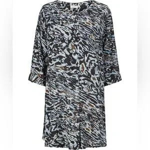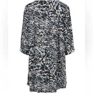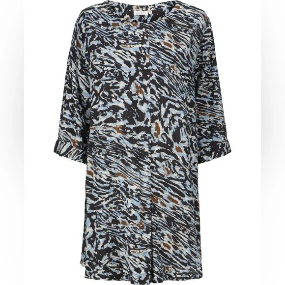 Chic tunic with a bold print. Features a mix of black, blue, and brown colors. Perfect for a trendy look. Great with tights & ankle boots.
