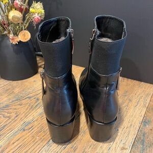 Elegant wedge ankle boots by Massimo Santini, crafted in smooth black leather with cozy faux-fur lining. Featuring side zippers with branded pulls, elastic side panels for added comfort, and non-slip rubber soles with a paisley pattern. Marked EU size 38 (fits US 7.5–8).