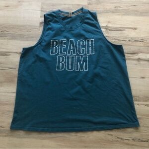This blue muscle tee is crafted from a stretchy, moisture-wicking material, perfect for athletic activities. Its modern cropped length and relaxed fit offer both comfort and style. The back features a sporty 'BEACH BUM' outline design, adding a unique touch to this versatile top.