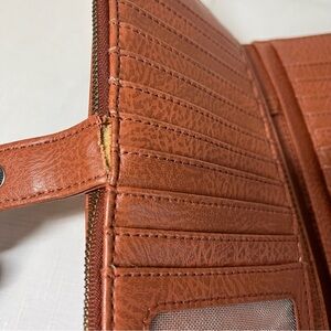 Note: the inside of the snap area not sewn. This doesn’t impact use of the snap and it can’t be seen on the outside of the wallet. Some wear on the bottom corners. See pics. Rest of wallet very good condition!