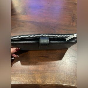 Wallet with snap closure and zipper coin pocket. Front pocket with snap closure. Interior: 11 card slots, 3 bill compartments. Dimensions: 8.25" x 4" x 1"