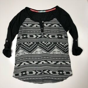Maurices rollup sleeve top with an Aztec and geometric black and white zigzag pattern on the front. The sleeves can be rolled down or rolled up and closed with the button. Three buttons detailing the top of the neckline. Front of the shirt is light weight, flowy and is slightly see through as it is a sheer chiffon style fabric (see my hand in photo). The bottom hem is scooped and the black of the fabric has a slight grain texture to it. In excellent used condition with no flaws as it was only worn once. Women’s size SMALL.