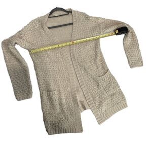Cream coloured. Very good condition. Size small but it’s an oversized fit. Beautiful loop knit detailings make it very soft and cozy. See photos for condition and measurements.