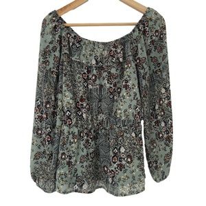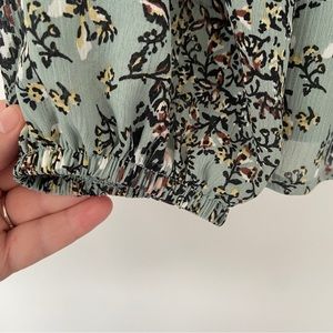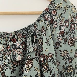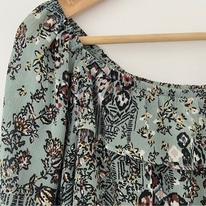 MAURICES SAGE GREEN/RUST/YELLOW POET BLOUSE WITH RUFFLE NECK, BISHOP SLEEVES, XS
