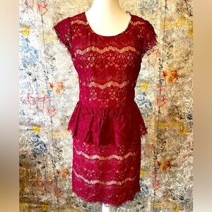 MAUVE ANTHROPOLOGIE Red Wine Crotcheted Peblum Dress.