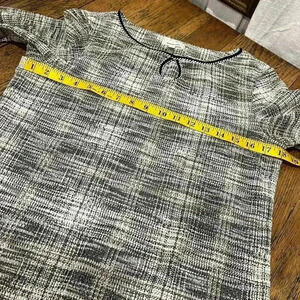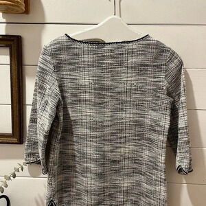 Chandail texturé à manches 3/4 de Max Studio. Motif noir et blanc, encolure goutte d’eau avec détail tressé, tissu léger et structuré, parfait pour le travail ou le quotidien. Taille S. Très bon état.