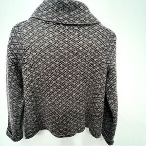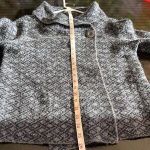 Elegant classic cropped boxy style. Soft and cozy fit, dress up or down! One interior button and one large exterior button. Triangle print can blend with many other pieces. Measurements in photos.