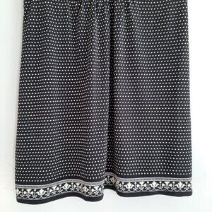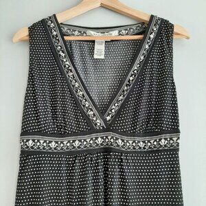 • Sleeveless deep vee neck babydoll style pullover tee in black with white polka-dot pattern and boho floral border.