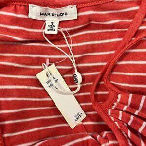 MAX STUDIO Fiesta Orange/Ivory Off-Shoulder Cap Sleeve Dress - Small - NWD $98. Brand new with tags, but only defect is some of the threads have some loose on one strap. Doesn't affect wear at all, but could be restitched. Color: H. Fiesta/Ivory. Retail: $98. Style 7903F63. A stretch knit dress with lots of stretch. 95% rayon, 5% spandex, made in China.