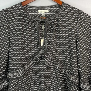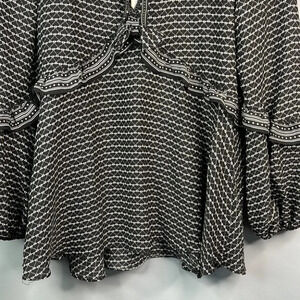 New ladies black and white Max Studio tie front micro heart print boho oversized ruffled long balloon sleeve blouse.