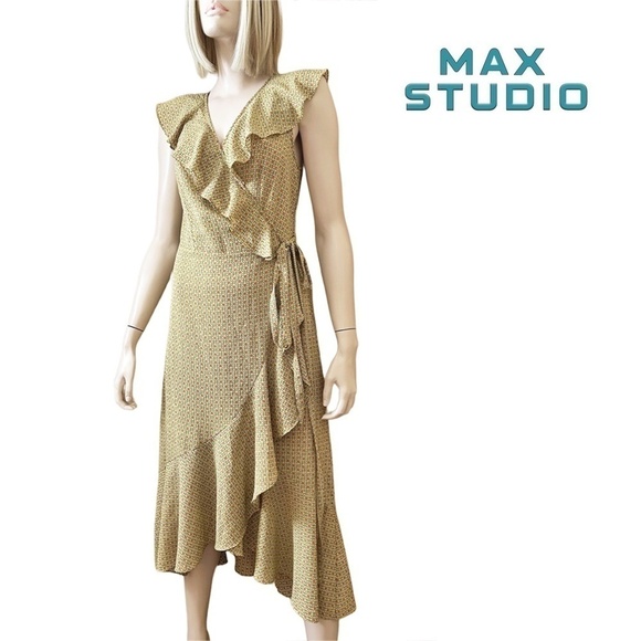 MAX STUDIO Ruffle Wrap Dress Midi Flutter Neckline Flowy Flounce Hem Hi-Low