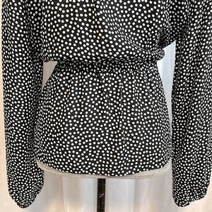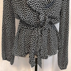 MAX STUDIO polka dot ruffle blouse with bow tie waist band and elastic waist and arm. V neck wrap style front. Excellent condition. Polyester material.
