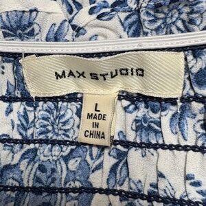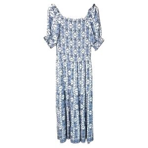 MAX STUDIO Silky Easy Care Maxi Dress Smocked Bodice Tiered Skirt Blue White L