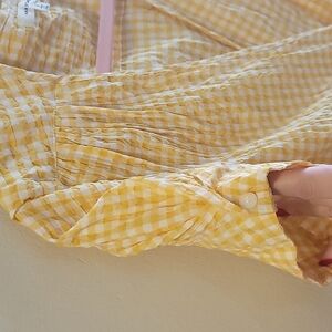 Max Studio yellow seersucker Gingham wrap top with puff sleeves
