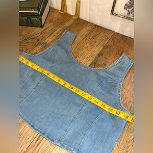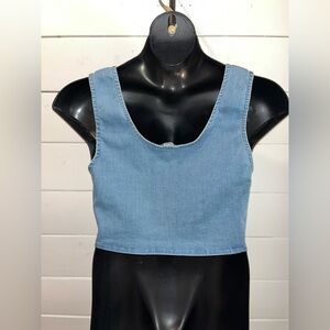 Casual and versatile denim crop top with a scoop neckline and a fitted cut. Made in a stretch fabric for comfort and ease of movement. Perfect to pair with high-waisted skirts, pants, or shorts for a relaxed and modern look. Size UK 18 / EUR 44.