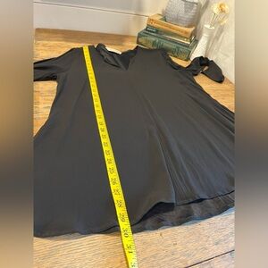 Flowy black long-sleeve blouse with soft V neckline. Light, smooth fabric with graceful drape. Loose fit — ideal for both workwear and casual elegance.