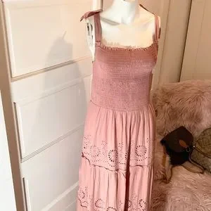 AN ELEGANT MAXI DRESS IS DESIGNED WITH A SMOCKED BODICE & AN EYELET EMBROIDERED SKIRT 🌸square neck 🌸tie up straps 🌸smocked bodice 🌸eyelet skirt 🌸100% viscose 🌸lining 100% cotton Machine wash