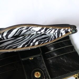 Amazing black faux leather (PVC) wallet/wristlet/clutch by MAXX with wrist strap. Fold over style with loads of zippered compartments - no shortage of storage in this wallet! Funky zebra pattern interior and gold tone hardware. Measures approximately 9" across and 4.5" tall (when folded). Pre-owned but in excellent condition. Smoke-free, pet friendly home!