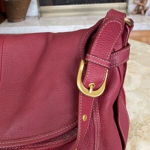 Beautiful Maxximum hobo style bag in genuine red leather with gold tone hardware. Classic and elegant, this is a good sized bag in excellent preowned condition. Featuring two exterior slip pockets, fold over top with magnetic closure. Interior is lined in gorgeous paisley print satin and is totally clean with a zippered pocket and two slip pockets.