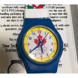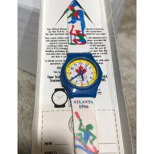 This official Olympic watch from the 1996 Atlanta games is a collector's piece, featuring vibrant graphics and original packaging. The watch is ideal for Olympic enthusiasts and collectors, showcasing the spirit of the games with its colorful design and precision timekeeping.