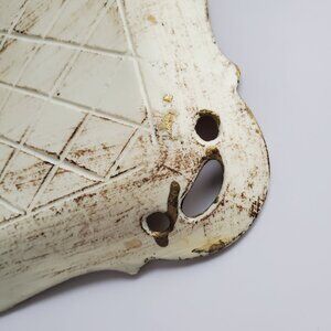 A very pretty piece of the past * rectangular plastic melamine serving tray / home decor piece * beautiful floral bouquet centre on creme embossed design background * goldish bronze trim accent with cut out design * vintage 70s era * very good well kept vintage condition * size: 14"L x 10.75" W