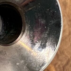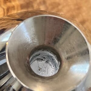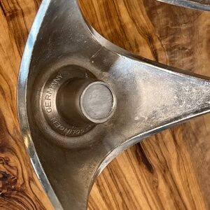 Elevate your home decor with this set of two MCM Solingen aluminum candle holders, crafted in Germany during the 1950s. Their brushed chrome finish and sculptural design bring a touch of mid-century modern elegance to any setting.