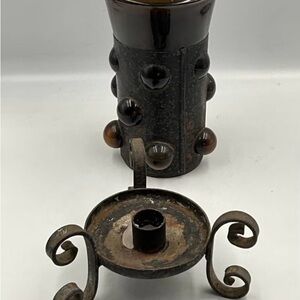 🕯️ The heavy metal holders wrap around the warm amber glass like mid-century armor — both decorative and functional. Perfect for a retro bar setup, vintage man cave, or rustic cabin decor.