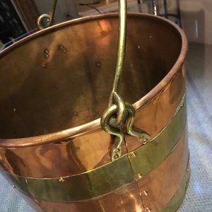 Brass coal bucket with two riveted copper staves, the brass handle attached at the side by a hook mount. Great for kindling, blankets, ice, etc.