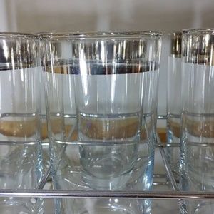 Six glass with worn silver coloured overlay with caddy. Great MCM piece. Change out glasses as desired.