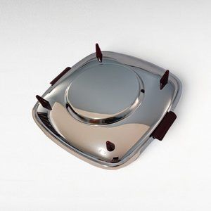 MCM Glo Hill Gourmates Vintage Chrome Bakelite Footed Chrome Serving Tray, dating back to the 1950s-60s, is a Canadian-made classic. Adorned with Cherry Bakelite handles and on its feet. Size of approximately 12" x 12". Despite its age, the tray remains in very good condition, showcasing only minor scratches indicative of its history and general usage. A testament to the enduring charm of mid-century design. Collectable item