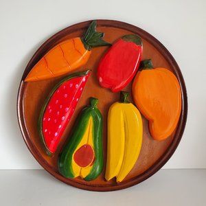 MCM Hand Carved Wood Wall Plaque Fruit & Veggies Plate Haitian Art Colourful