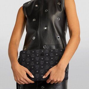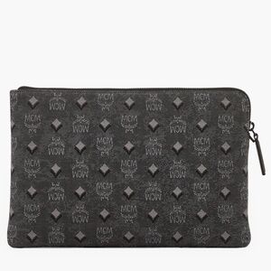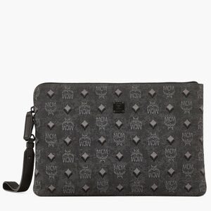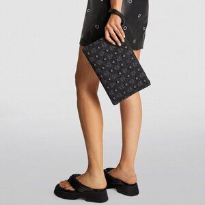 Logo-embellished jacquard brings a vintage-inspired look to this bold pouch finished with a removable wristlet strap for contemporary styling.