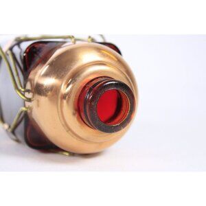 A smaller bottle or flask made in Sweden, styled like an antique train lantern. The red glass and copper body are in good shape with small marks of age, the brass top holds a stopper which is in good shape and without smells. The inside of the bottle looks clean. Marked on the bottom "Made in Sweden".