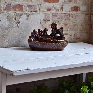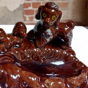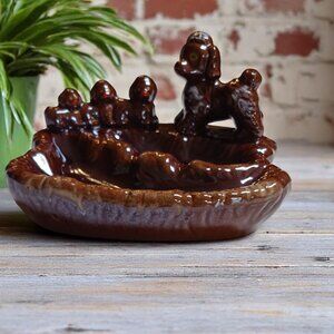Adorable vintage poodle ashtray, made in Japan, likely from the 1950s–1970s. Features a glossy brown mother poodle followed by three baby poodles circling the outer rim. Finished in a rich high-gloss glaze, this figural piece is both decorative and collectible. Measures approximately 5" x 3" x 3" high. In excellent condition with no chips or cracks. A piece of old masking tape on the base reads 1990 yard sale” — possibly a resale date. I’ve left the tape intact to avoid damaging the glaze; the new owner may remove it if desired. A charming example of mid-century Japanese novelty ceramics, perfect for poodle lovers or kitsch decor fans.