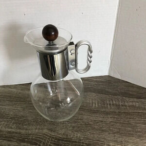 Heat proof glass with a metal twisted handle and lid with a wooden handle. Very good condition no chips or cracks, there is a bit of rust between the outside of the glass and the metal banding. This does not affect the functionality of the piece.